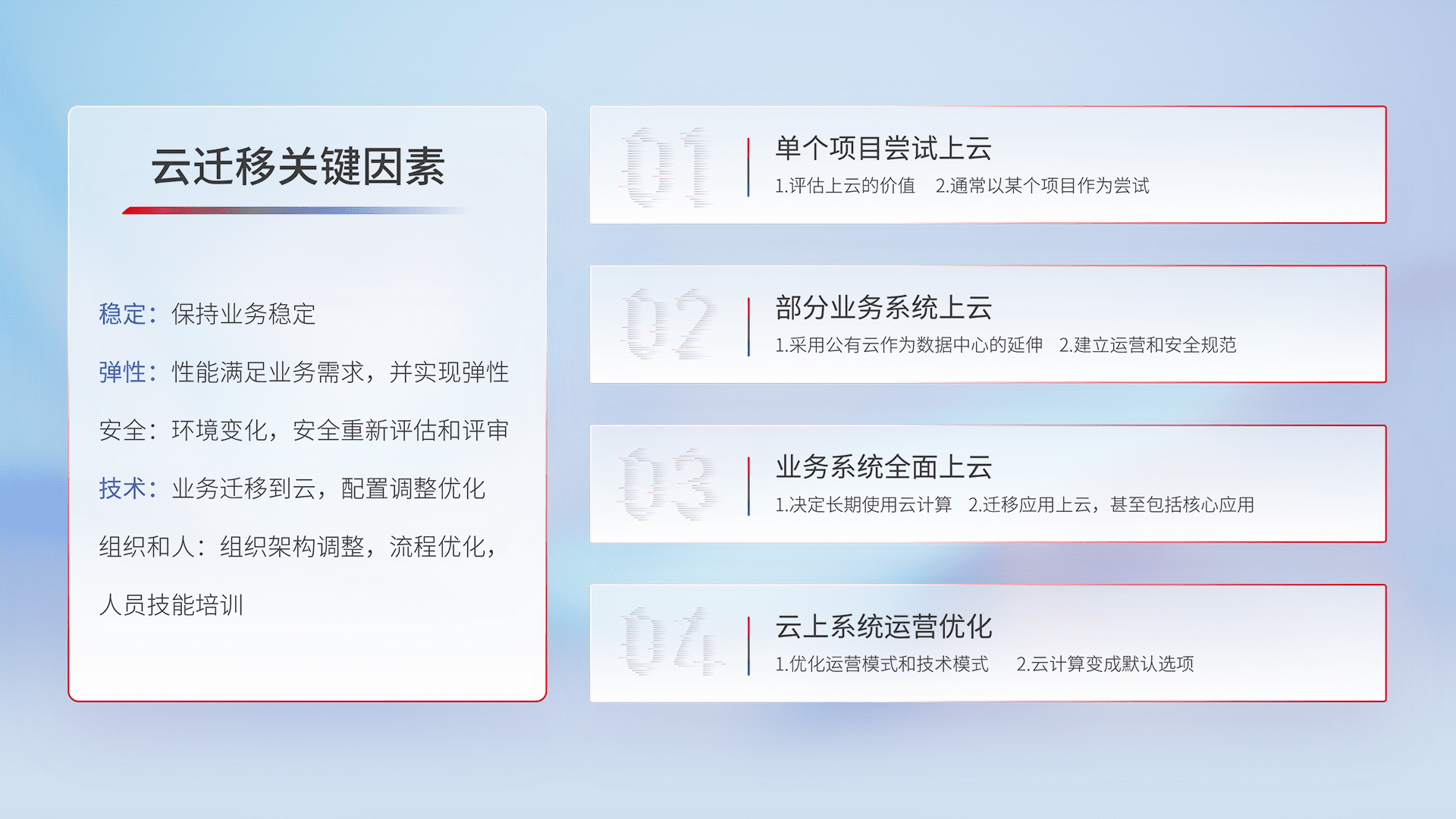 结合实际业务,,从规划设计、、、、云平台选型、、云原生改造、、、数据迁移、、集成交付,,迁移全过程为客户识别最佳上云路径,,,做好风险识别管理,,设计网络架构、、、身份权限、、、、安全审计合规、、、操作审计、、、、日志审计、、监控告警策略、、、、多站点容灾设计等,,,对云上基础设施进行整体规划,,提升IT治理水平,,,,以满足弹性、、高可用、、、、高性能的需求。。。。